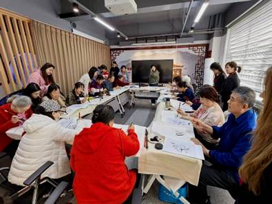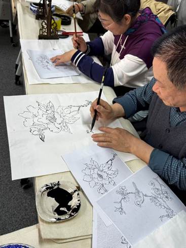 活动中,2024级音乐系步冰冰、王子墨、闫慧怡,绘画系乔文华,2025级设计系王煜霄、计宣宇、商镠、王金华、赵一诺,绘画系崔邺文等同学分工协作、各展所长。闫慧怡进行声乐表演,计宣宇讲解国画知识与水墨技法,阐释传统艺术文化内涵。社区居民亲手绘制了茶花、荷花等国画作品,感受中华优秀传统文化魅力。